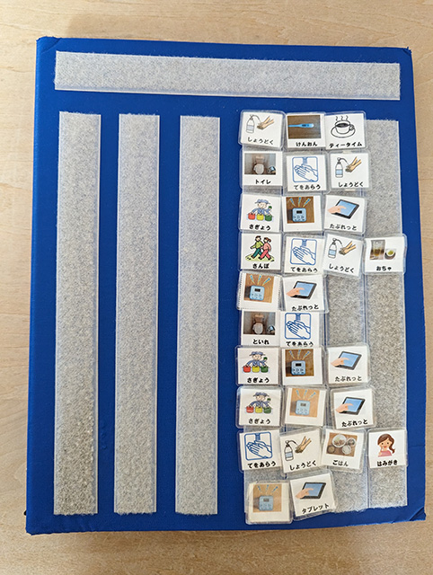 いつ、何をするか?1日のスケジュールや活動などを、文字やイラスト写真などを用いて提示することで見通しを立てやすくしたり、何度も確認する事で安心感を促すねらいがあります。